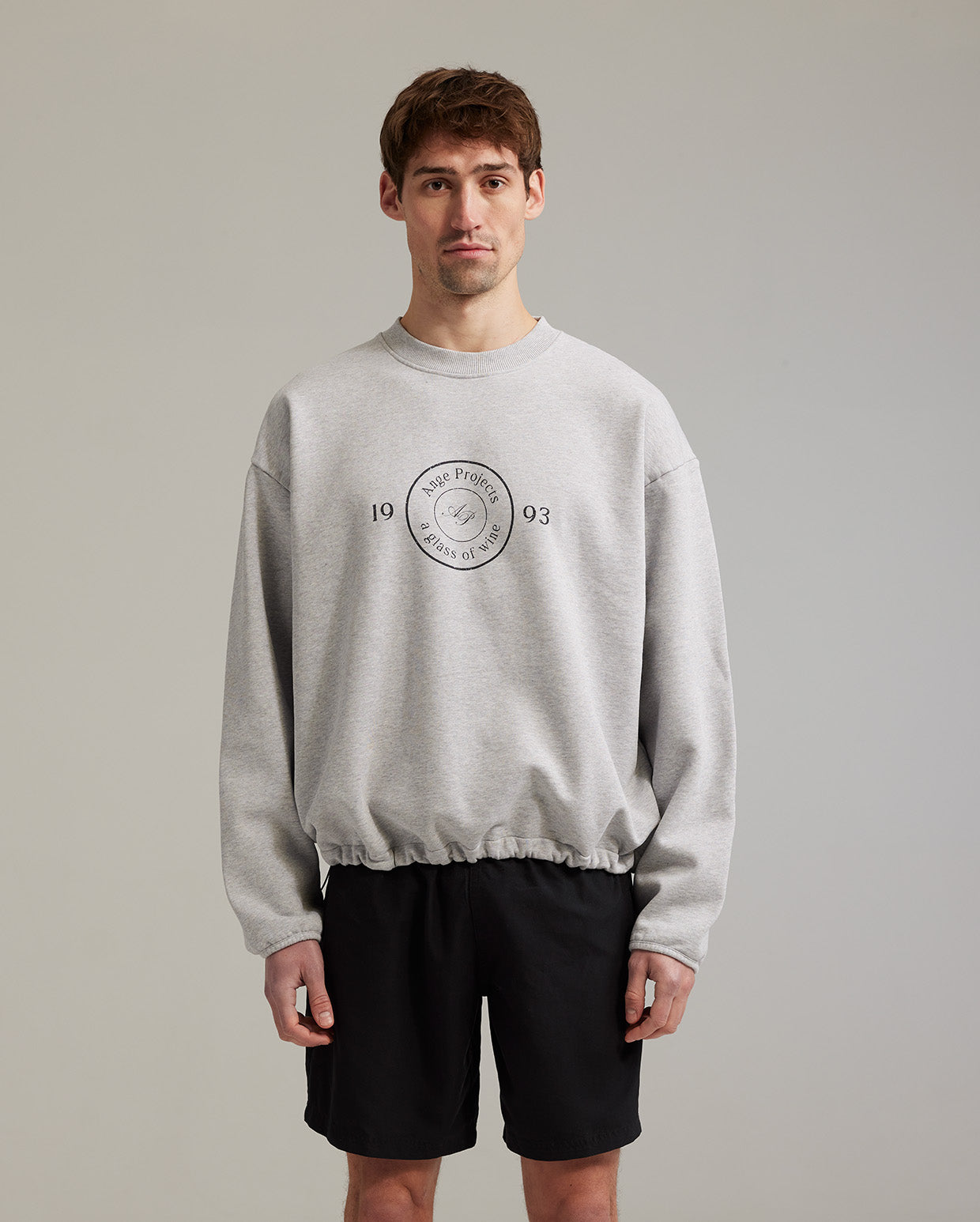 Crewneck with a ribbed collar and piping on the cuffs. Adjustable elastic cords at the hem allow for a cropped or straight fit. This style features a screen printed artwork.