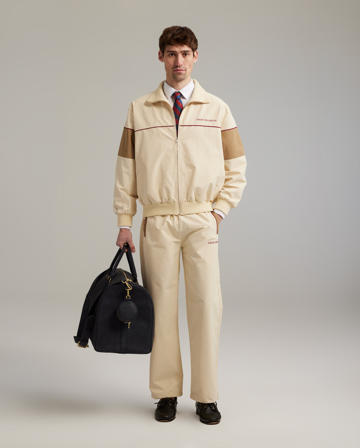 Retro track jacket with bordeaux piping, big collar and heavy rib collar, cuffs and hem. YKK zippers for closure. This style comes with matching trackpants.